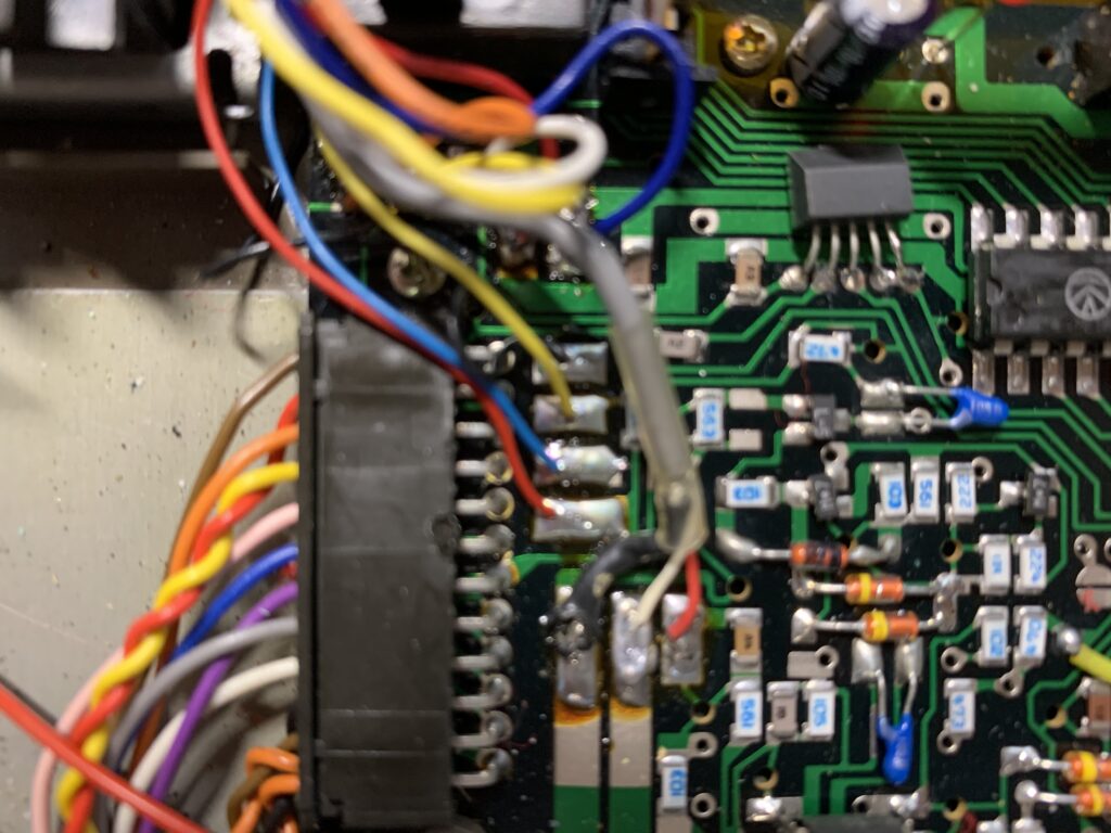 下段左から、黒、白、赤の順にはんだ付け。中段は、上から黒、黄、青、赤の順にはんだ付けします。